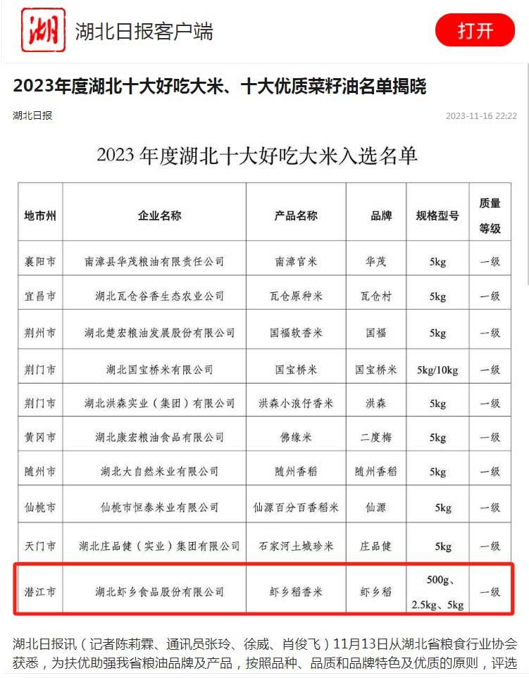 蝦鄉稻入選2023年湖北十大好吃大米名單